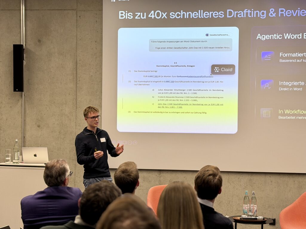 Instead of founders demonstrating features, this time practitioners from international law firms and consulting houses took center stage. They showed how AI solves concrete problems in their workflows and how much you gain when technology starts exactly where legal work is especially intensive.